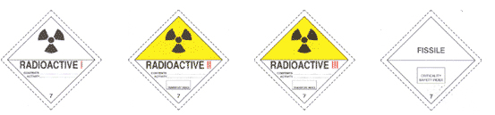 | Toda cantidad de bultos con contenido radioactivo que tenga la etiqueta III-AMARILLA (LSA-III). Algunos materiales radioactivos en “uso exclusivo” con materiales radioactivos de actividad específica baja no tendrán la etiqueta, pero se requiere el cartel de RADIOACTIVO. |
